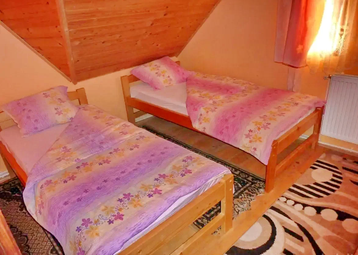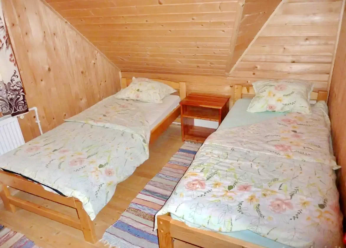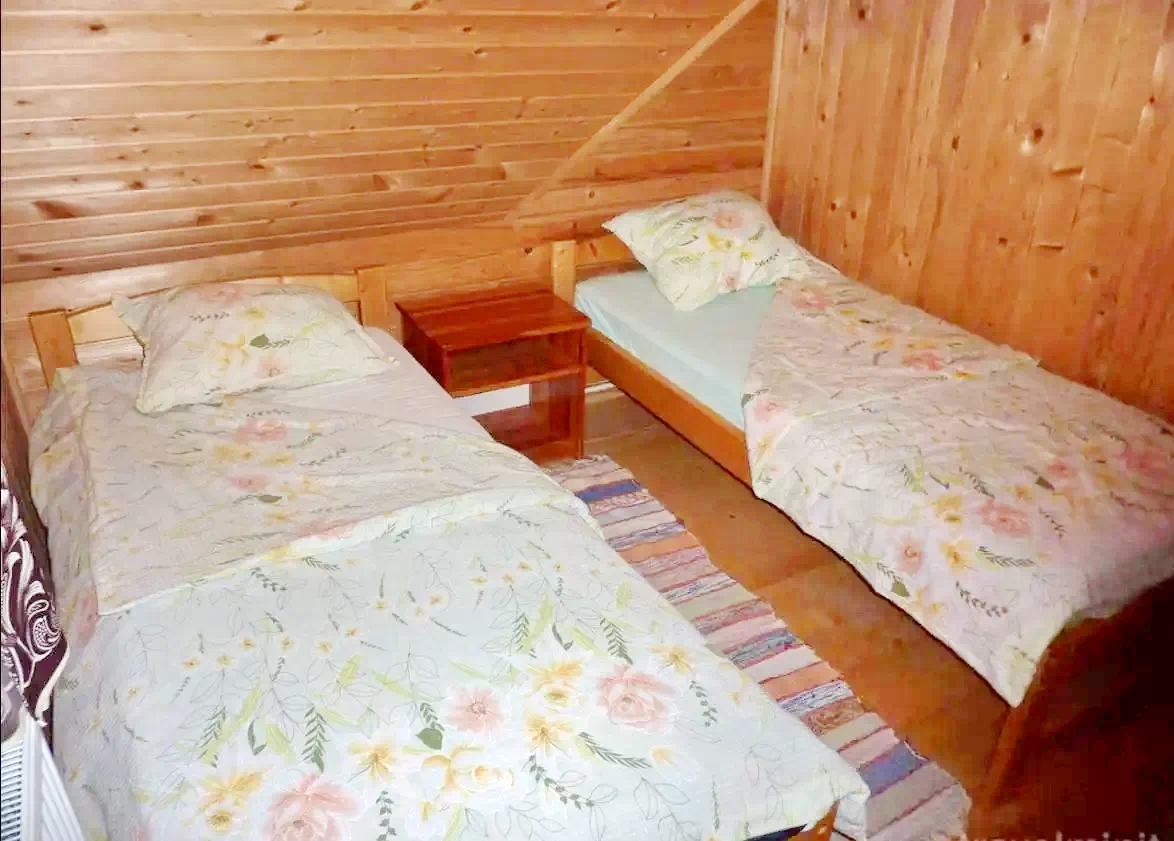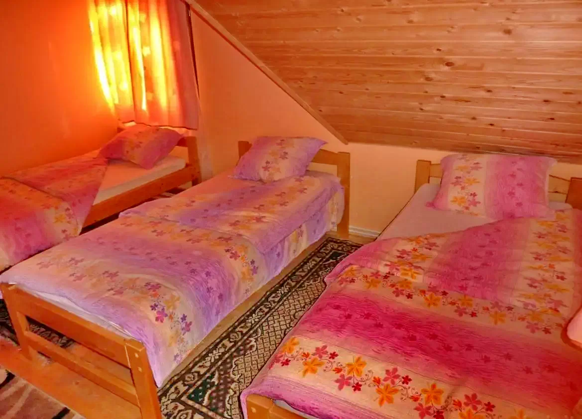Az emeletre egy külső lépcsőn jutunk fel, ahol négy szoba van. Az első szobában két egyszemélyes ágy, a következő szobában egy egyszemélyes ágy, a harmadik szobában három egyszemélyes ágy kapott helyet. A három szobához közös fürdőszoba tartozik. Az utolsó szobában két egyszemélyes ágy található. Ehhez a szobához saját fürdőszoba tartozik. (Összesen 11 (+2) fő!)