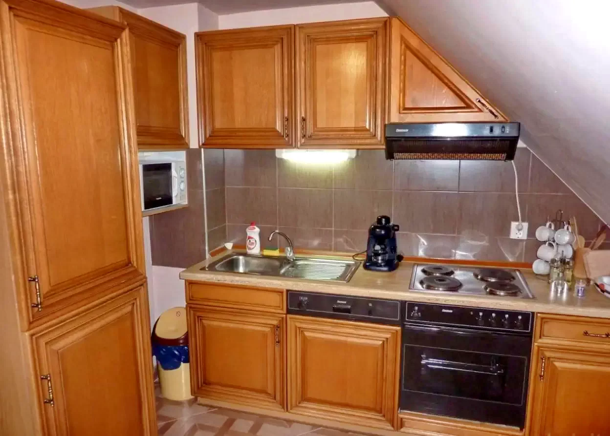 - A kulcsosház modern konyhája minden szükséges eszközzel felszerelt, hogy Ön szabadon készíthesse el kedvenc ételeit. A villanytűzhely, mosogatógép, hűtőszekrény, mikrohullámú sütő, kávéfőző, teafőző, kukta, valamint edények és evőeszközök mind hozzájárulnak a kényelmes főzéshez.