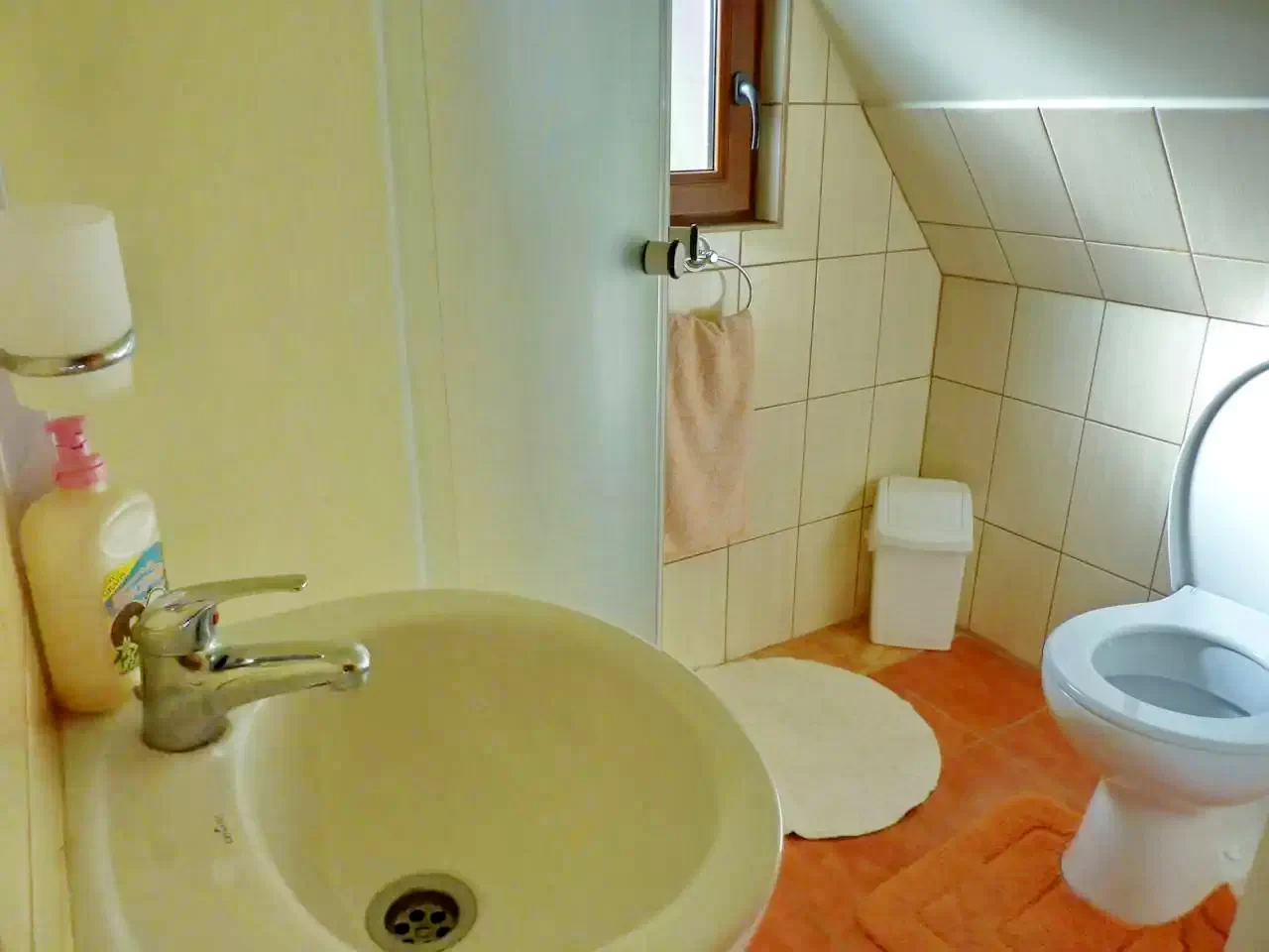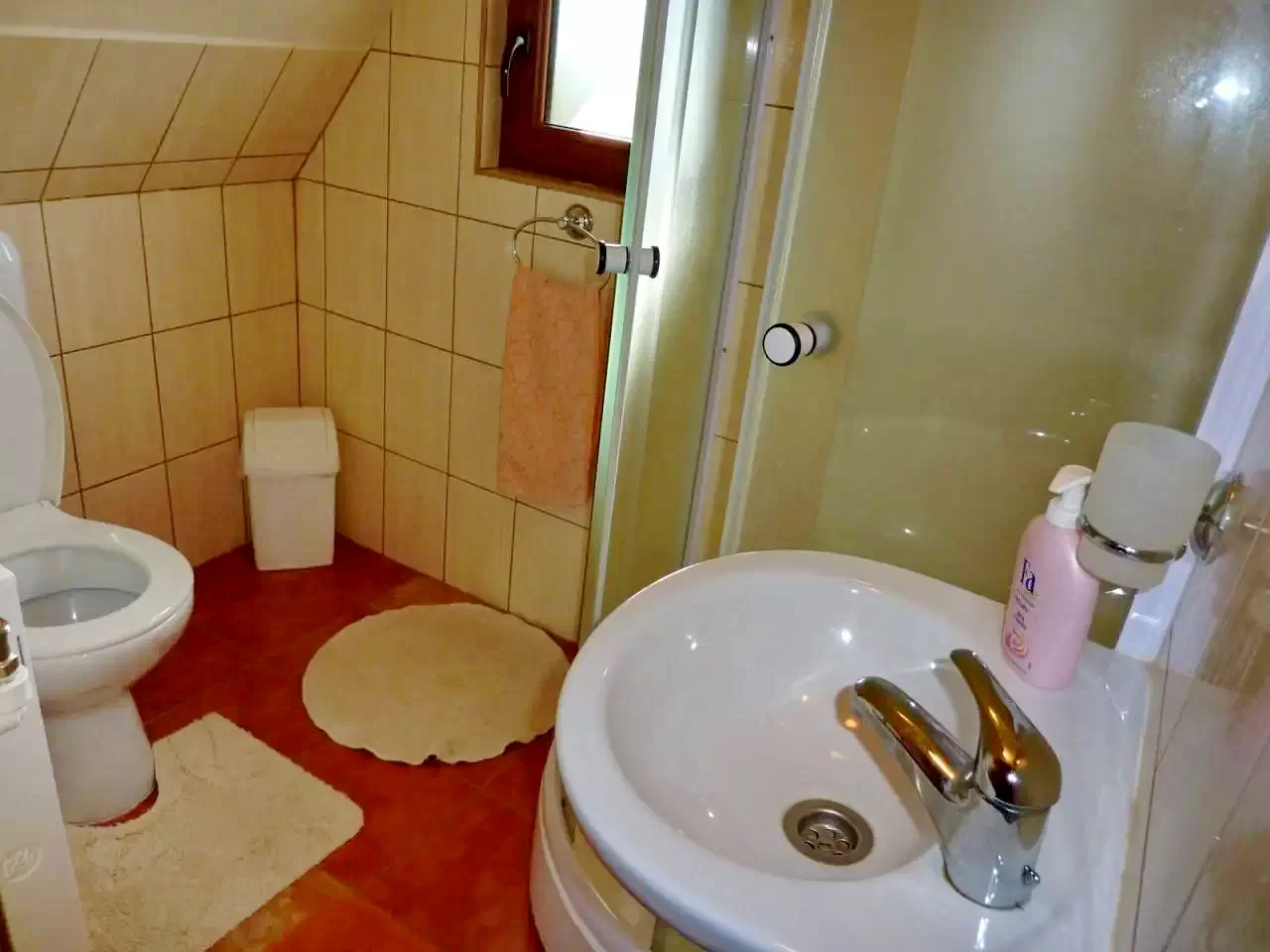 Fürdőszoba (zuhanyzó, vízöblítős WC, kézmosókagyló).