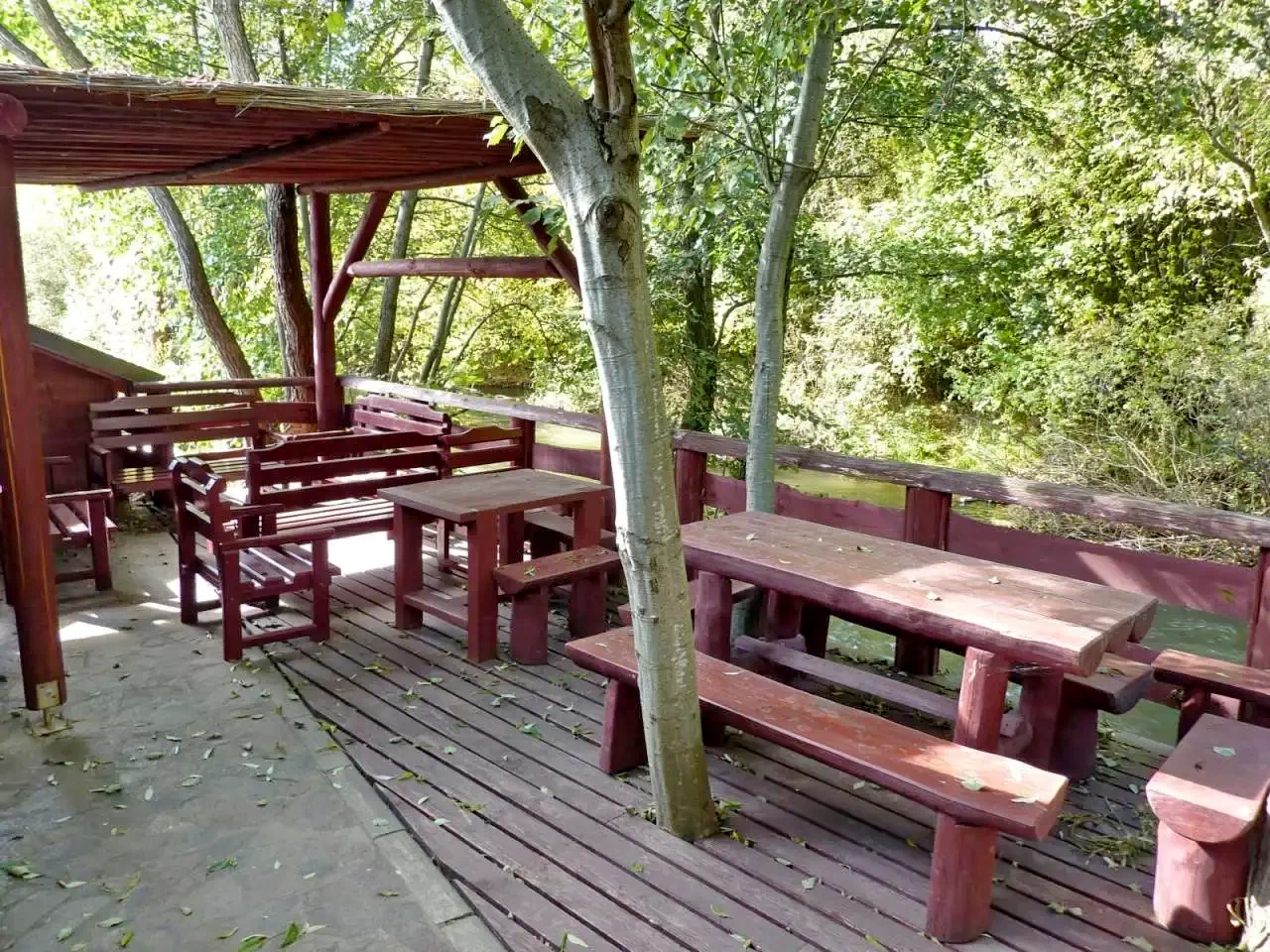 4000 m²-es udvar fedett sörözővel (filagória), kerti kiülővel, terasszal, hintával, lipinkával, csúszdával, homokozóval és gyerekmedencével.