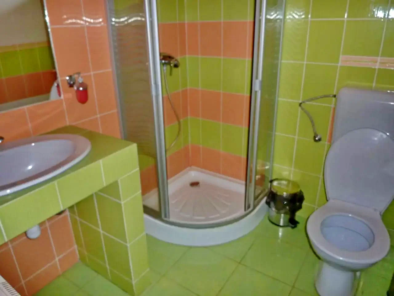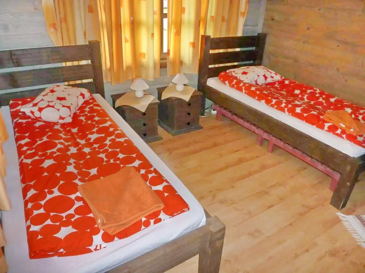szoba: 2 egyszemélyes ágy (2 fő), saját fürdőszobával (zuhanyzó, vízöblítős WC, kézmosókagyló).