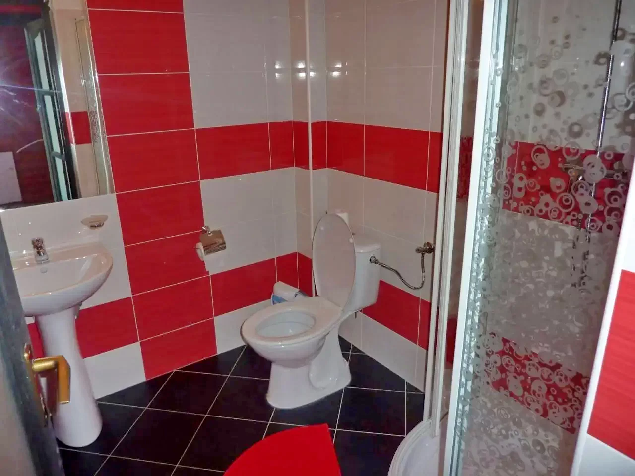 szoba: 1 kétszemélyes ágy (2 fő), saját fürdőszobával (zuhanyzó, vízöblítős WC, kézmosókagyló).