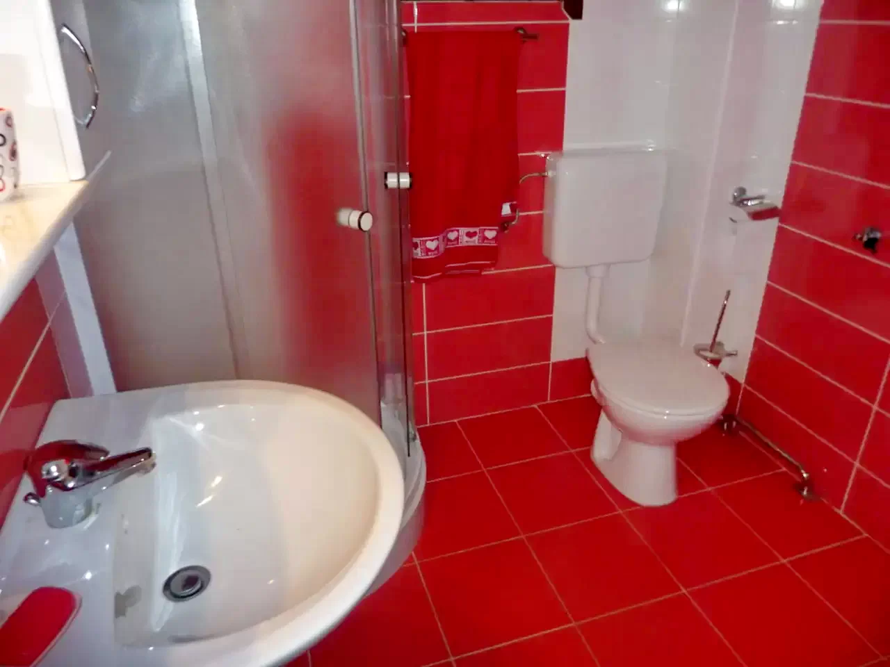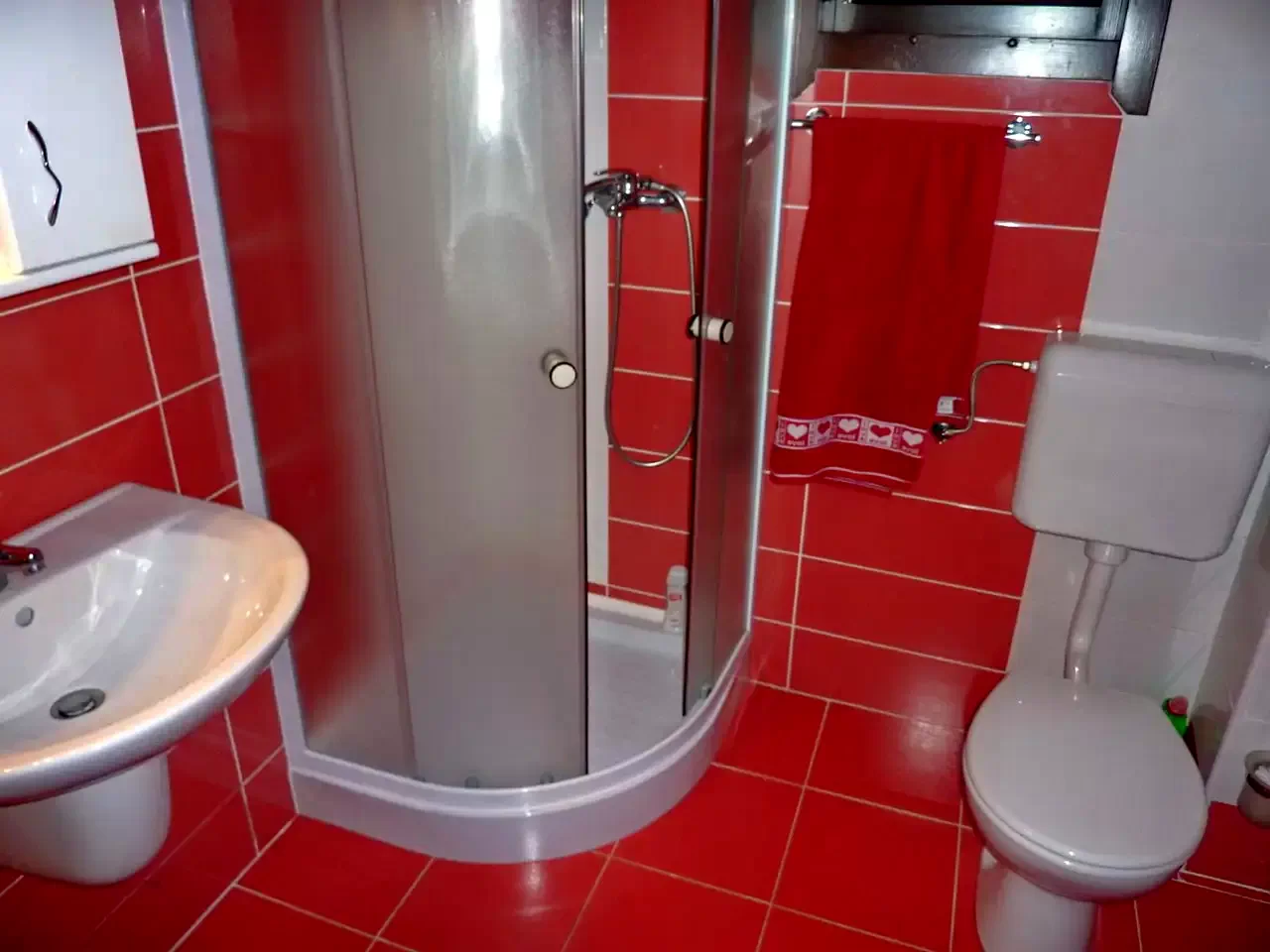 Fürdőszoba (zuhanyzó, vízöblítős WC, kézmosókagyló).